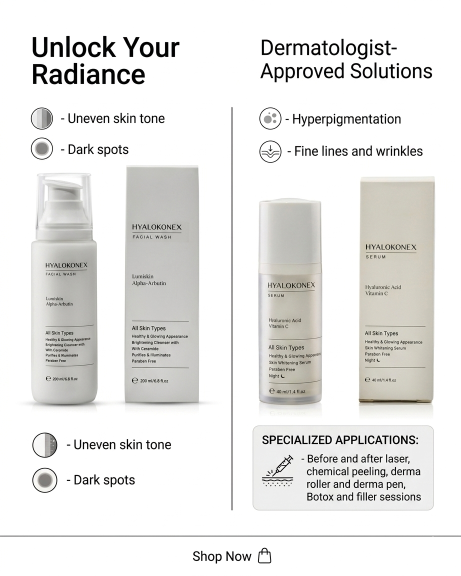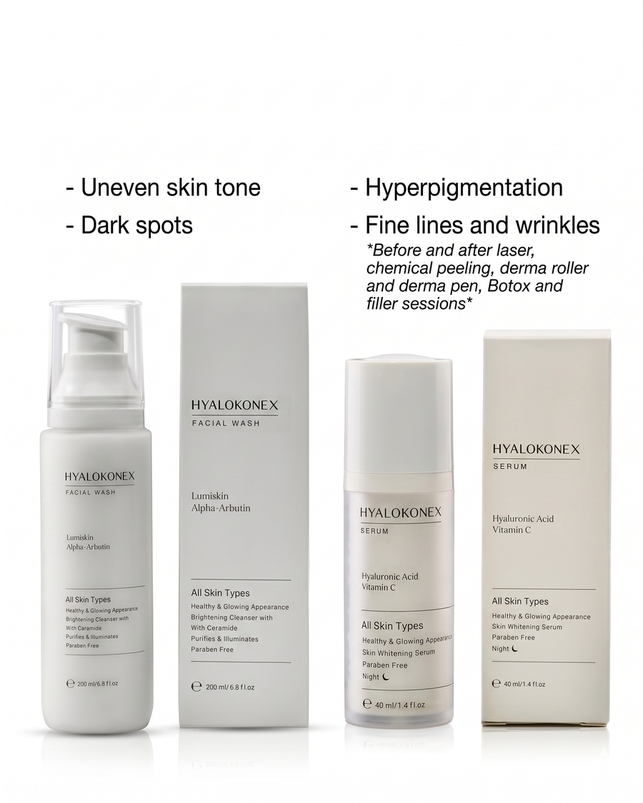 روتين العناية ببشرتك مش محتاج خطوات كتير معقدة، هو بس محتاج المنتجات الصح! رجّعي لبشرتك نضارتها وشبابها مع مجموعة "هيالوكونيكس - Hyalokonex"، الحل الطبي المتكامل لتفتيح البشرة ومحاربة التجاعيد.