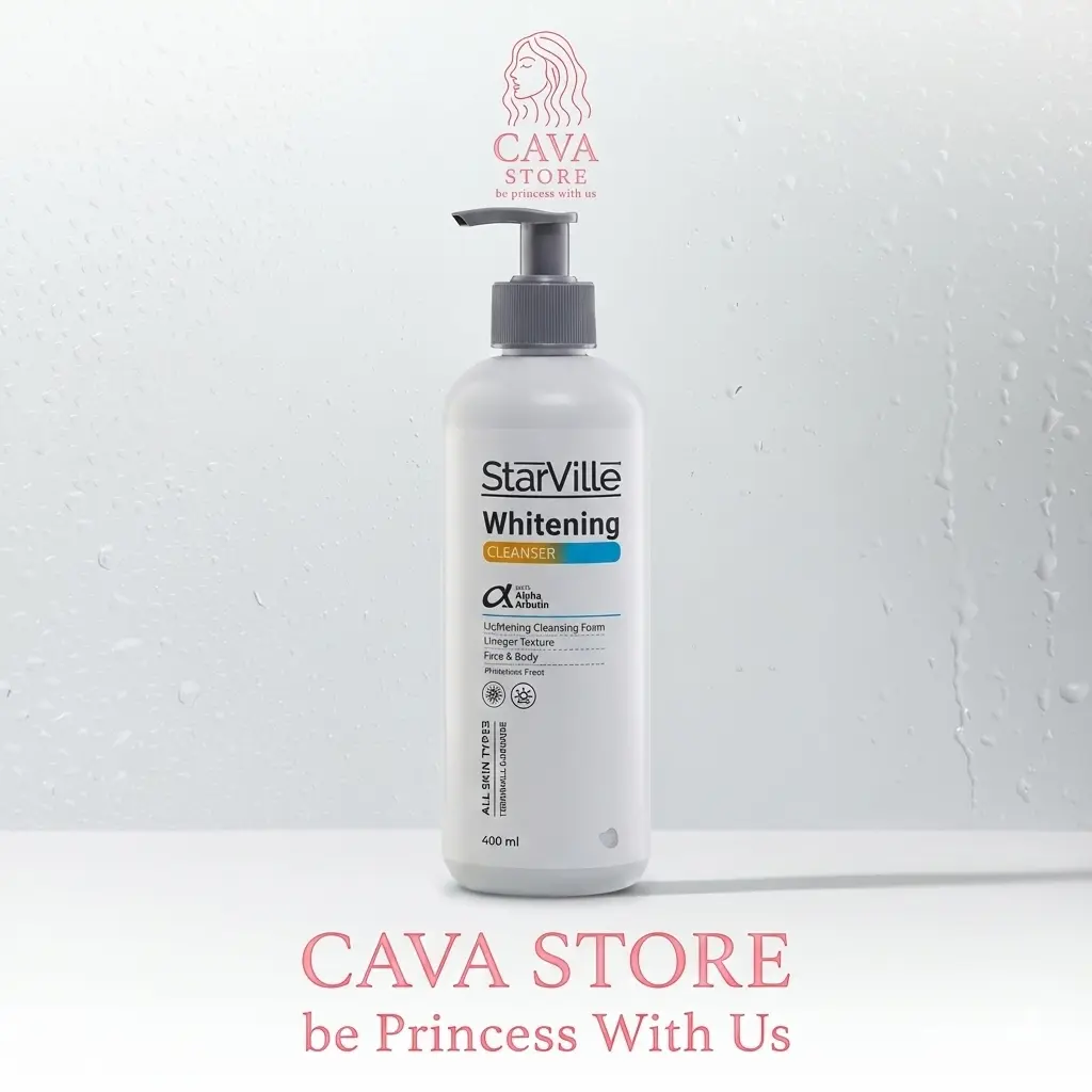 نقدم لكِ في CAVA STORE الحجم الكبير من غسول StarVille Whitening Cleanser (400 مل)، المصمم خصيصاً ليمنحكِ عناية متكاملة للوجه والجسم معاً. يأتي بعبوة "مضخة" (Pump) عملية وسهلة الاستخدام، وبكمية وفيرة تكفي لفترة طويلة، مما يجعله الخيار الاقتصادي الأمثل لروتين التفتيح الشامل.